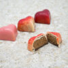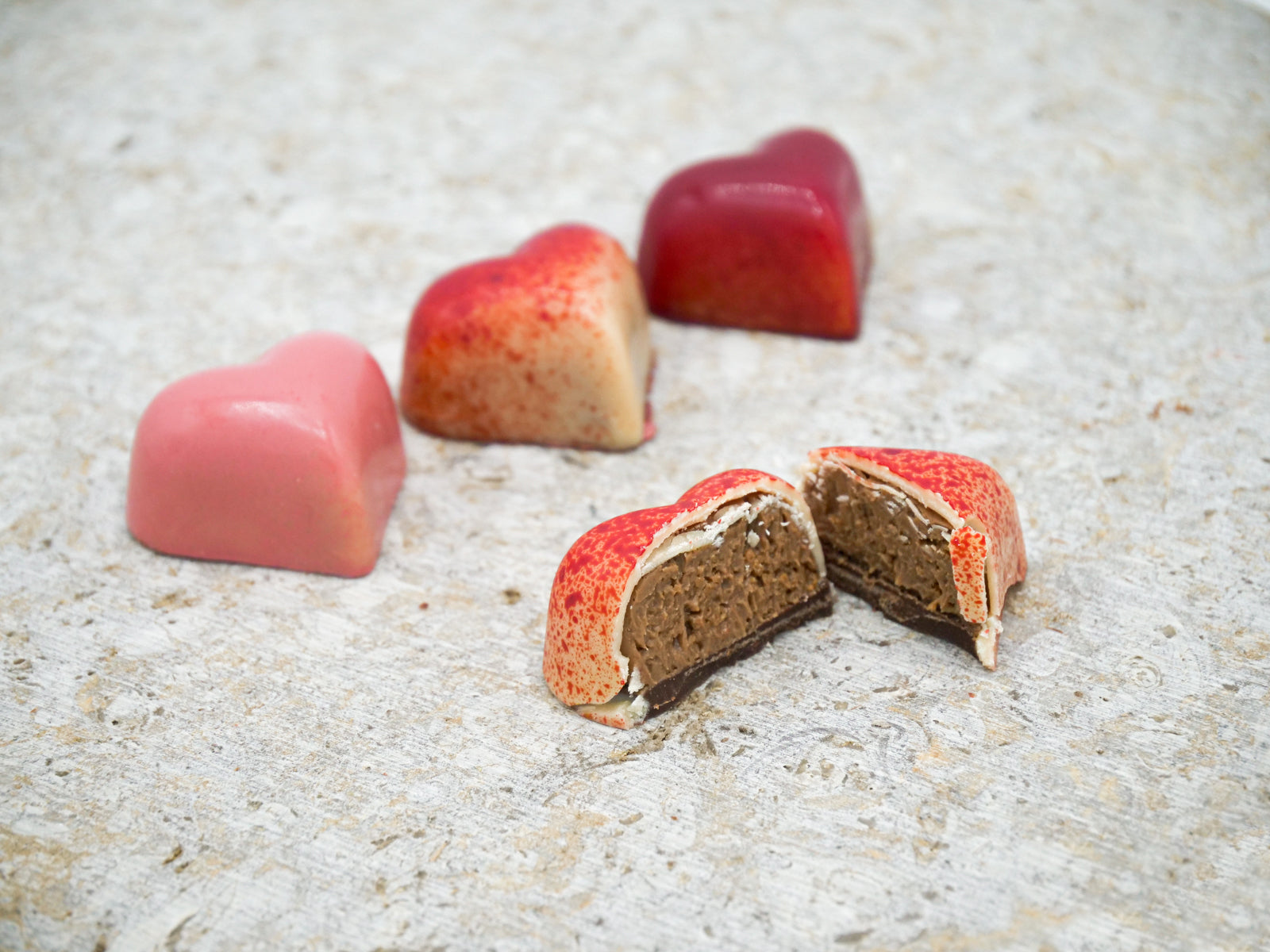 White, milk & dark chocolate sweethearts. Filled with caramel & praliné.