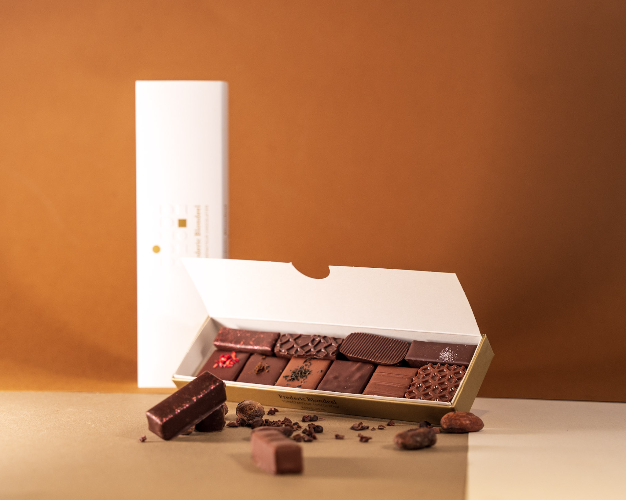 The word ganache refers to the soft center of this range of pralines. A perfect marriage of our finest chocolate and cream. Paired with some of the best ingredients such as jasmine, cognac, fleur de sel, cardamom, basil … The fine coat of chocolate gives it its delicate snap.