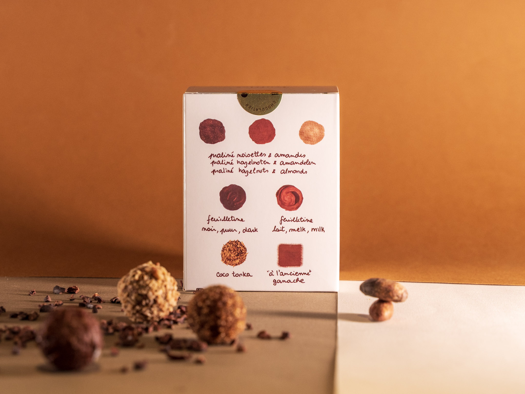 We have created a full range of different truffle experiences. Adding texture rolling the centers in cassonade, a delightful crunch with our milk & dark feuilletine fillings.
