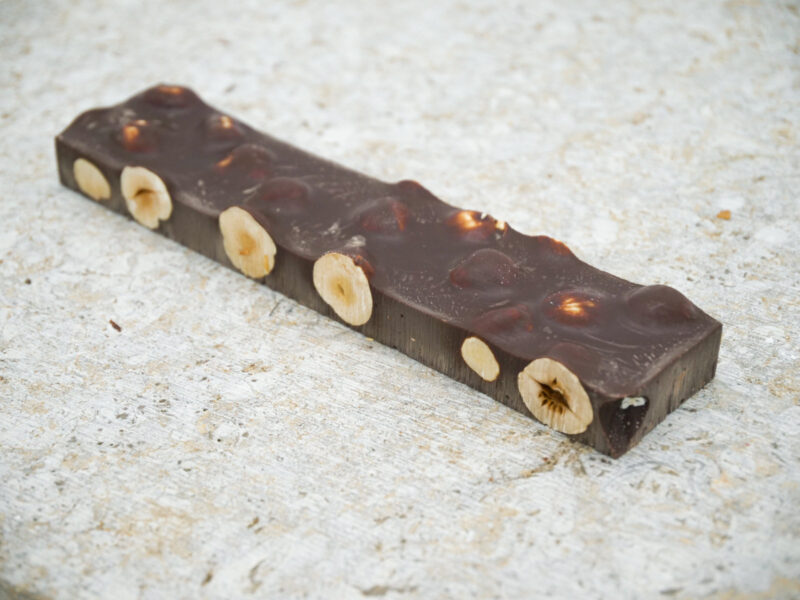 Dark chocolate 70% gladiators with roasted hazelnuts.